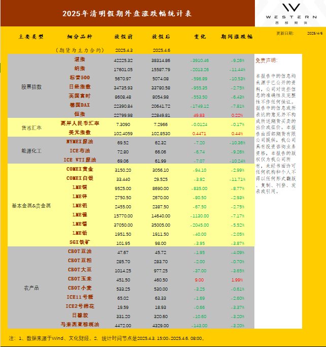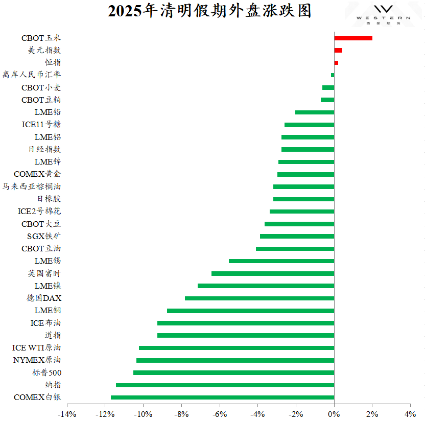 综合来看,2025年清明假期期间,美国超预期关税冲击与鲍威尔鹰派言论令海外市场承压,白银、纳指、标普领跌,原油、欧美股市、工业金属跌幅次之,仅玉米、美元指数、恒指微涨。