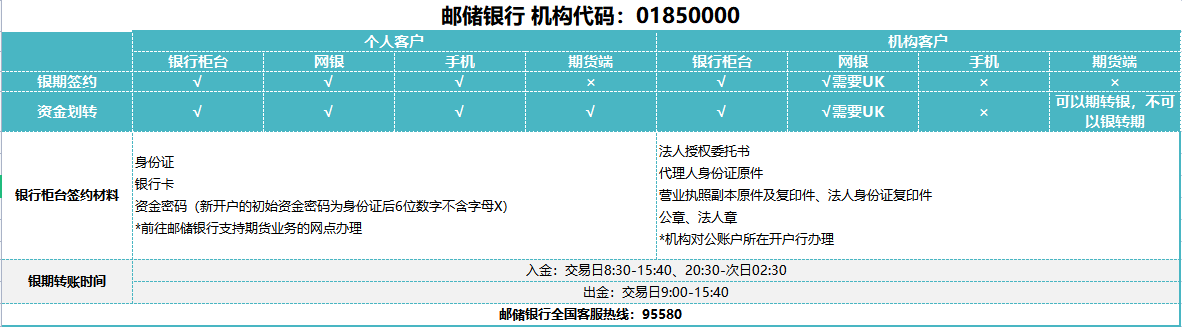注意:邮政储蓄银行机构客户要通过银行端入金,可以通过期货软件出金。