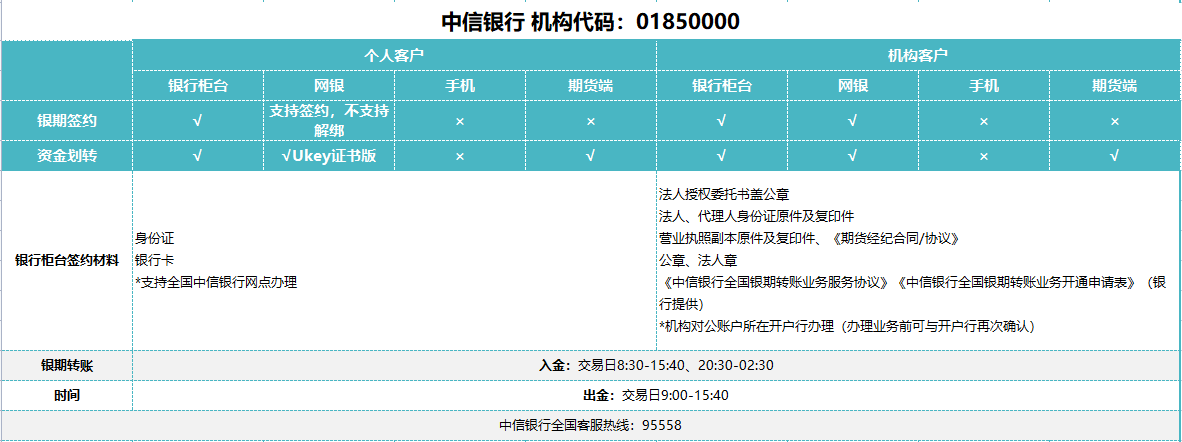 注:中信银行不支持手机APP办理银期签约,如有U盾或密码器可登录网上银行办理银期签约